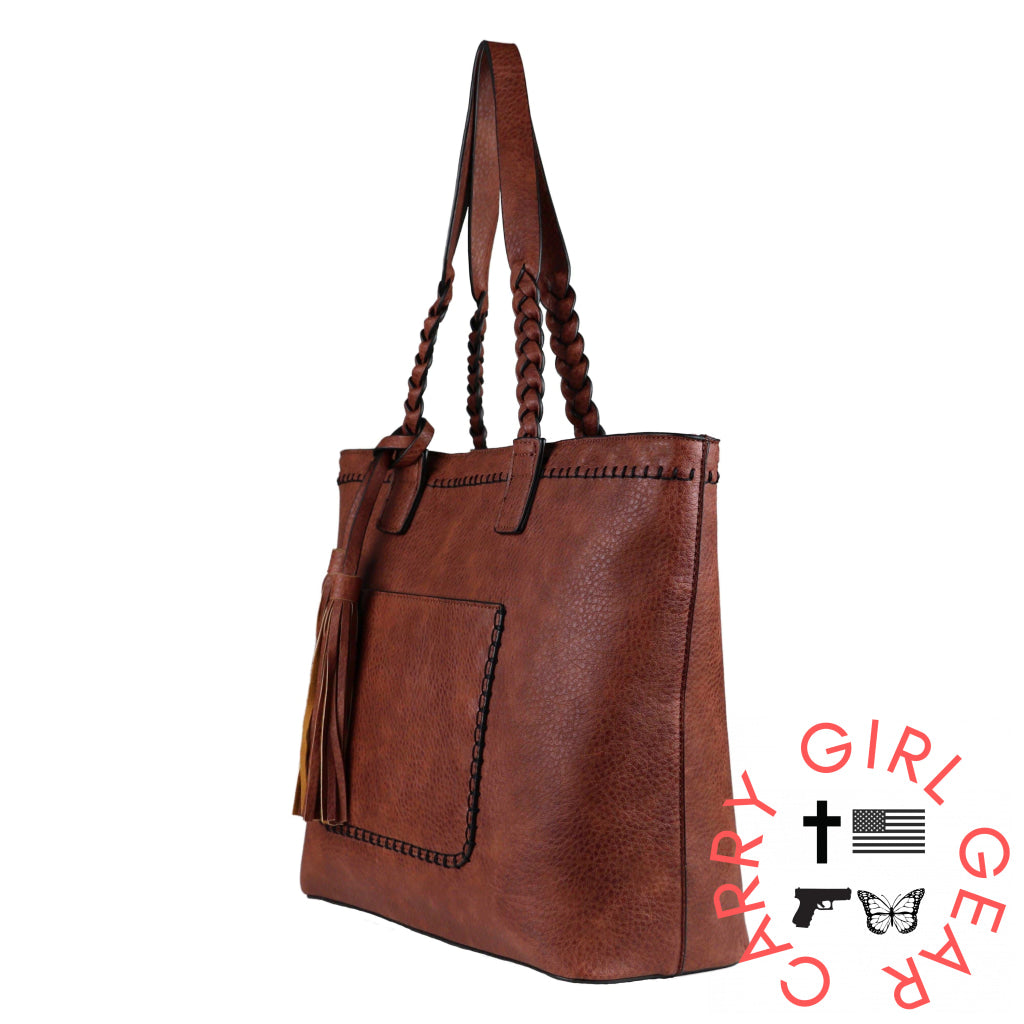 The Cora Tote from Lady Conceal showcases supple faux leather. The interior can fit a laptop, planner, work folders, gym clothes, and more. It features a full-length zippered pocket that divides the interior into two compartments. The front is crafted with two deep open slip pockets, the back has a zippered pocket, a large open pocket for your cell phone, and a key strap. An additional pocket with magnetic closure is located on the front. The attractive braided handles measure, (27" long with 13” drop).