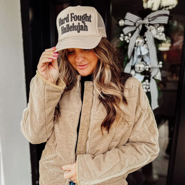 This one’s for the woman who didn’t get here easy. The Hard Fought Hallelujah Trucker Hat is more than a phrase, it’s a testimony. It’s for the prayers that came through tears, the praise that followed the storm, and the faith that stayed when walking away would’ve been easier. This hallelujah was earned.