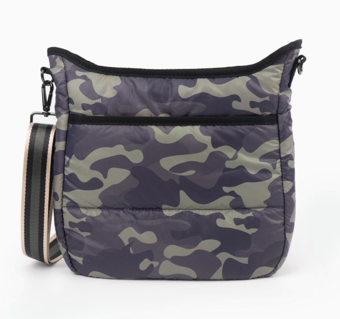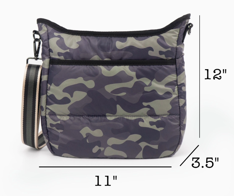 Puffy, lightweight design that’s comfortable to wear all day, Spacious interior fits your Bible, journal, wallet, and daily essentials (fits most smaller Bibles) Exterior pocket for quick-access items on the go, Easy crossbody messenger style, Durable fabric with a soft, cushioned feel, Finished with gold hardware for an elevated touch, Adjustable strap for a custom fit